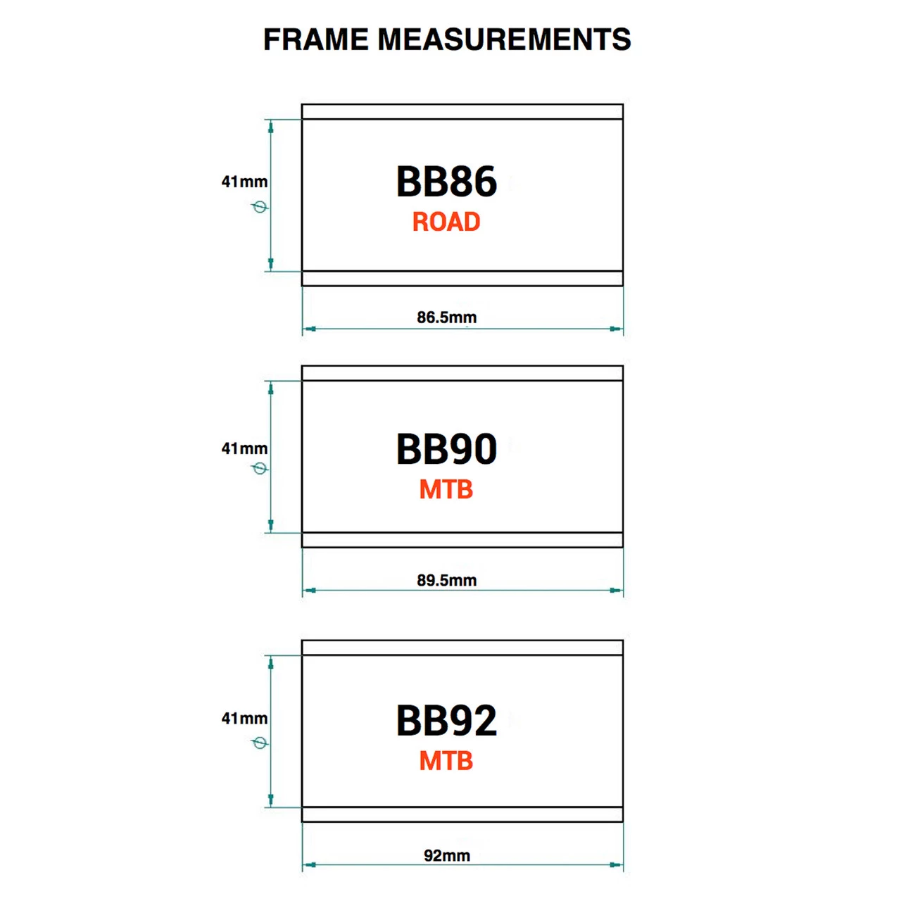- BB86 Road/BMX = 86.5mm width X 41mm diameter