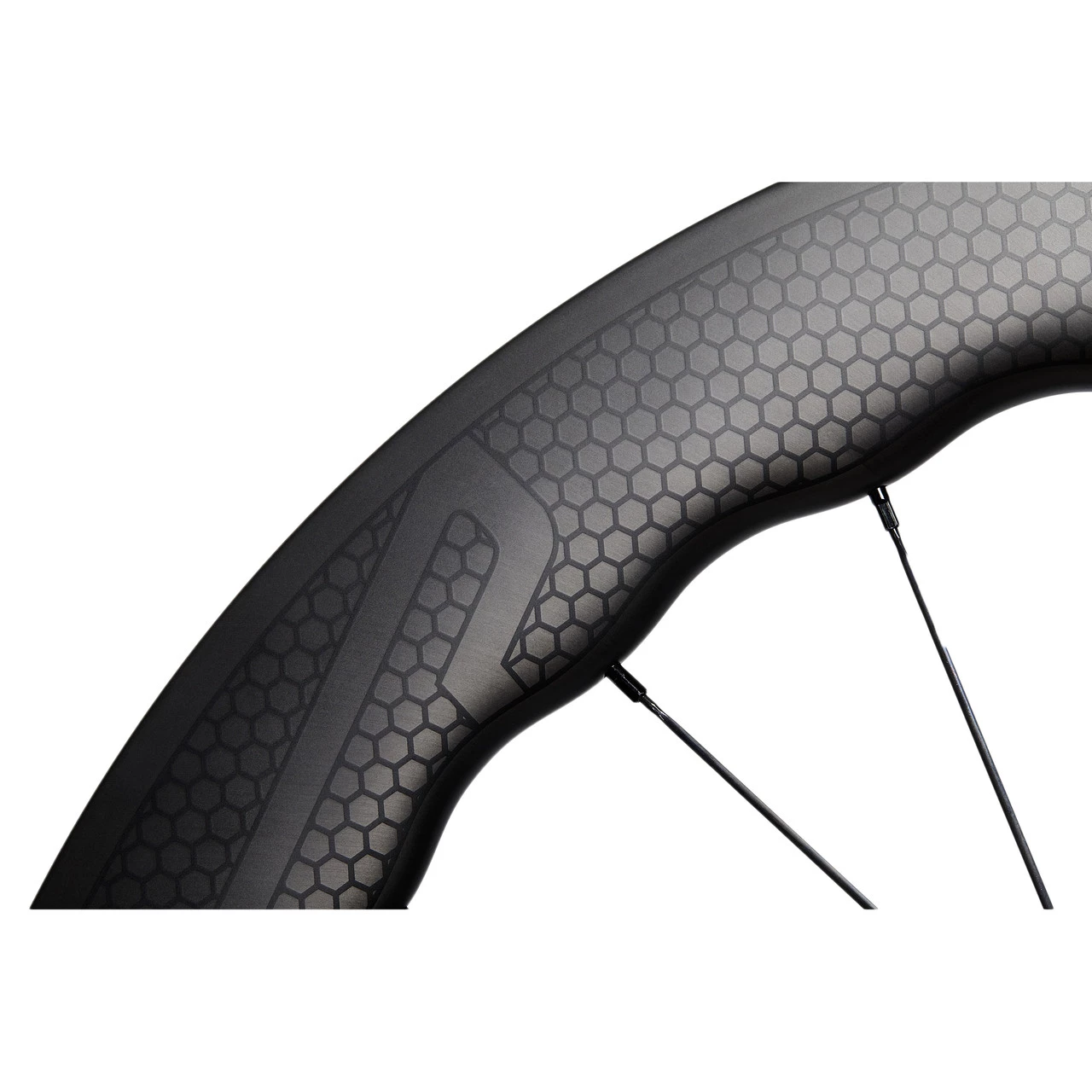 - Variable 65 to 60mm deep aerodynamic tubeless carbon rims, 18/26mm internal/external width