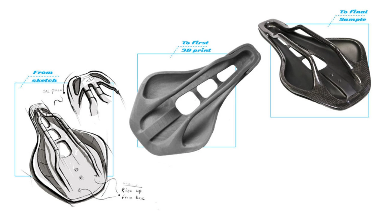 Made with laid-up carbon fibers rather than injection molded carbon, the saddle was created as a single piece. This means rails and shell are made as one, which gave them more control over the flex and compliance while also shedding grams